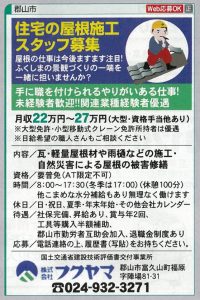 8月12日付の福島民報紙には、2月の地震から半年を経てもなお、県内では屋根や外壁の被災修繕が思うように進んでいないという記事が掲載されていました。弊社も然りで、未だにお待ちいただいている方々が多くいらっしゃいます。弊社では人手不足を改善すべく、求人募集活動をしています。今後、ますます重要性が増していく屋根の仕事を、フクヤマで一緒に頑張ってみませんか?