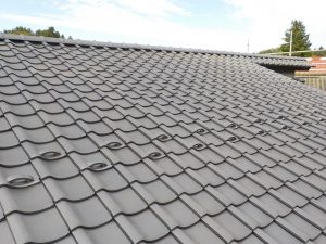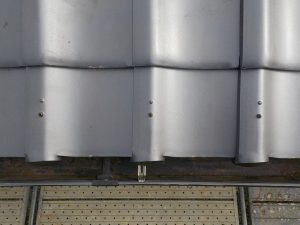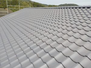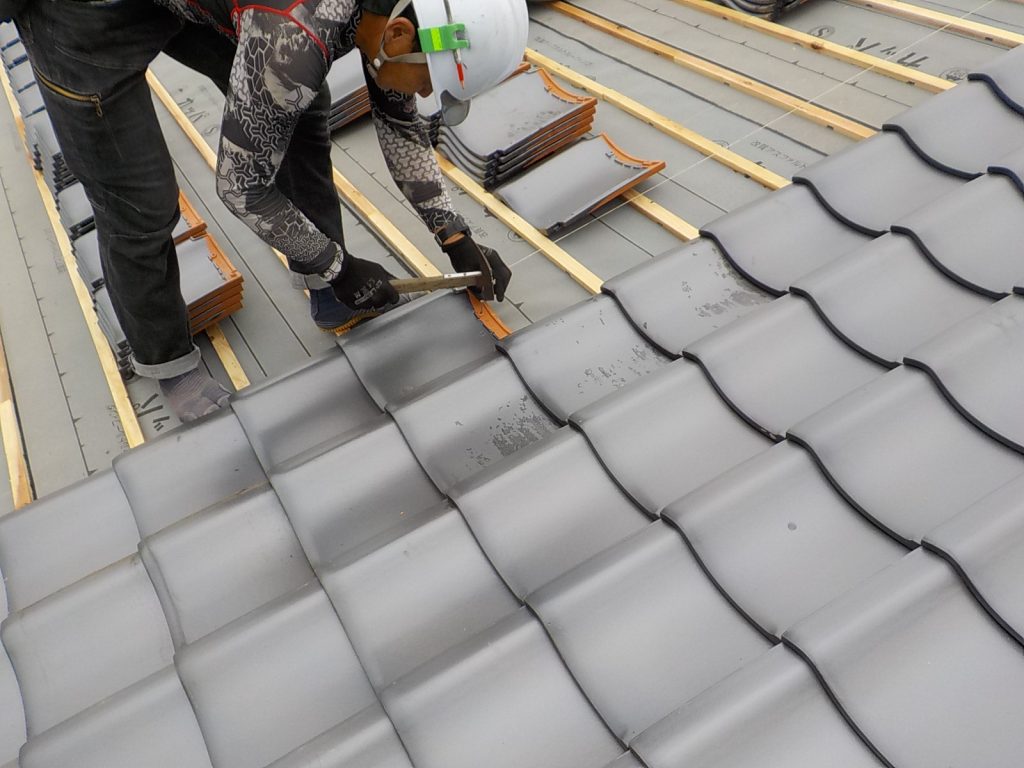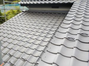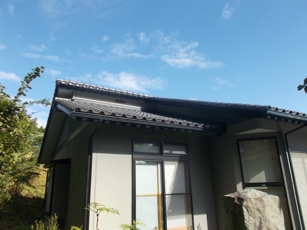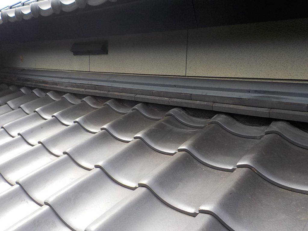 陶器瓦和型(新東㈱京銀色)にて、大変美しく葺き上がりました。軒先部(唐草)や袖部(ケラバ)はパッキン付ステンスクリュービスも用いて留めています。