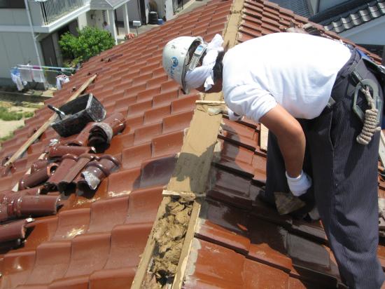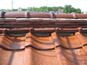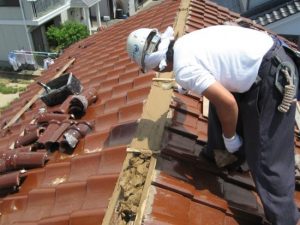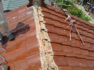 赤瓦のお宅です。取り合い部分(棟面戸)の大半に、モルタルが崩れて土の露出がみられました。既存の瓦を用いて直してほしいとのご要望だったので、一度大棟をばらして、できるだけ同じ瓦を用いて積み直しすることにしました。
