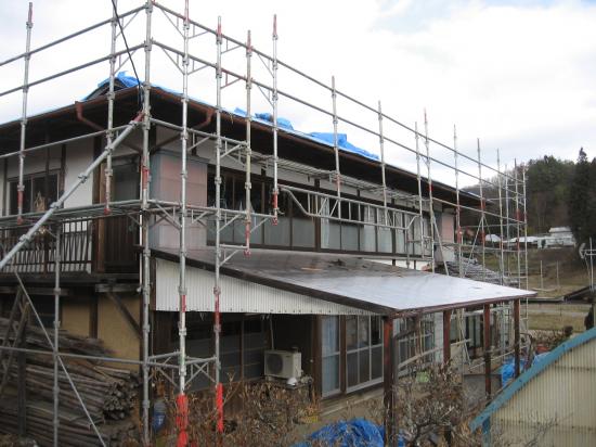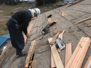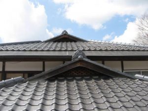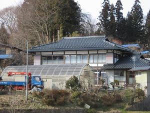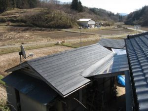 着工前の全景写真がなくて残念ですが、40年位前に施工した厚型スレート瓦のお宅でした。野地板の補修、瓦の葺き替え、一部破風巻き、雨どいの交換、物置屋根の板金葺き、ハイロンの施工など、イメージを一新させる工事内容になります。