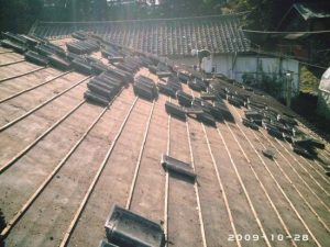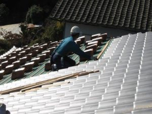 和型のセメント瓦(陣場瓦)の葺き替えです。瓦そのものはまだ丈夫なのですが、色が褪せてきてしまったため陶器瓦に葺き替えることになりました。新東株式会社の京銀色を採用しました。